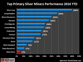 Silver and the silver mining stocks are some of the top performing assets in 2016. Silver was the top performing physical asset in the metal-commodity basket gaining 27% since the beginning of the year. Silver’s gains surpassed West Texas Oil which increased 24%, zinc at 20% and gold at 19%:…