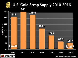 After the U.S. economy disintegrated in 2008, due to the Banking and Housing crisis, Americans pawned off a record amount of gold.  How much gold?  Nearly, 32 million oz (1,000 metric tons).  That’s one heck of a lot of gold.   Matter-a-fact, U.S. gold scrap supply at its peak of 160…