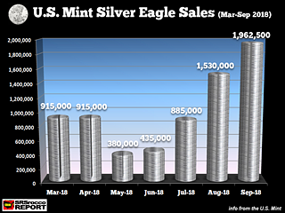 The sales of Silver Eagles surged in September as the U.S. Mint removed their temporary supply restriction. As the silver price continued to trend to new lows at the beginning of the month, several large purchases of Silver Eagles by the Authorized Dealers wiped out the inventory at the U.S….
