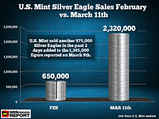With the spread of the Global Contagion, the demand for physical precious metals has increased significantly.  According to the U.S. Mint’s newest update, another million Silver Eagles were sold over the past two days.  This brings to total Silver Eagle sales in March at 2.3 million, more than three times…