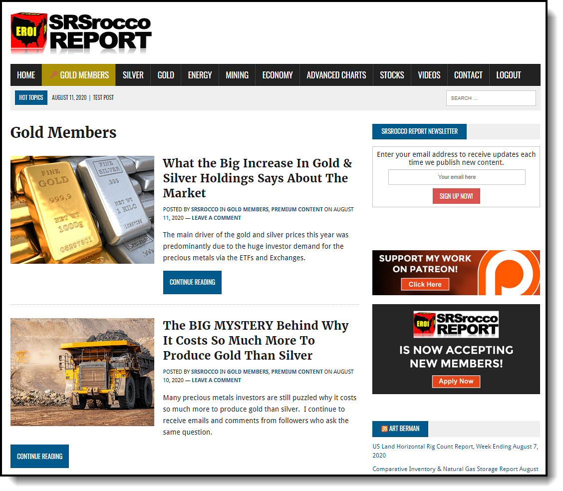 Some of the Gold Member posts will show up on the SRSrocco Report Main Page with a Gold Member button at the end of the title of each post, but all the content will be located in the Gold Members Area shown below: