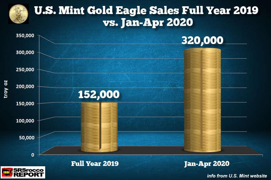 Even with the temporary shut-down of the U.S. Mint in April, another 101,500 oz of Gold Eagles were sold during the month. Thus, total Gold Eagle sales of 320,000 oz for 2020 is more than double the 151,000 oz sold during full-year 2019: