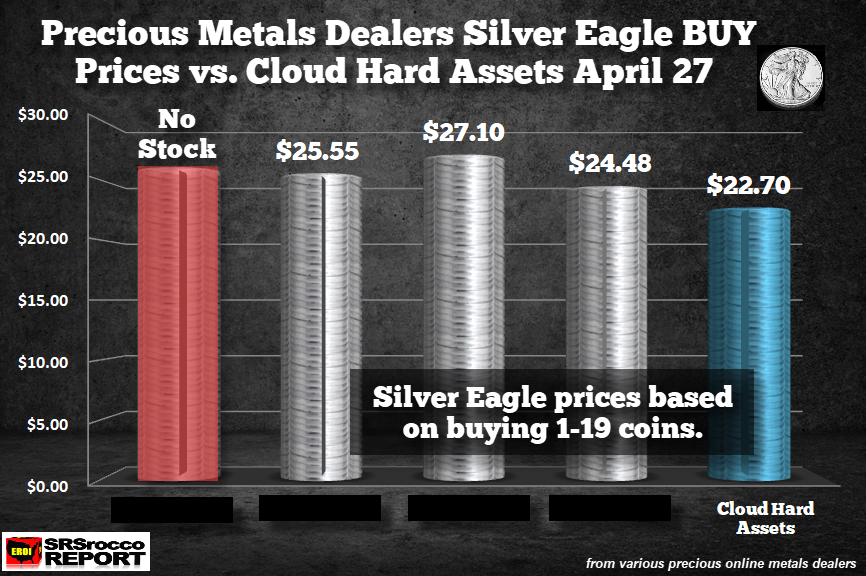 Tom said they were selling these newly arrived Gold Eagles at 8% over spot, which would be $1,847 based on a $1,710 gold spot price. Moreover, CLOUD HARD ASSETS also has the lowest premiums for Silver Eagles versus the leading online dealers: