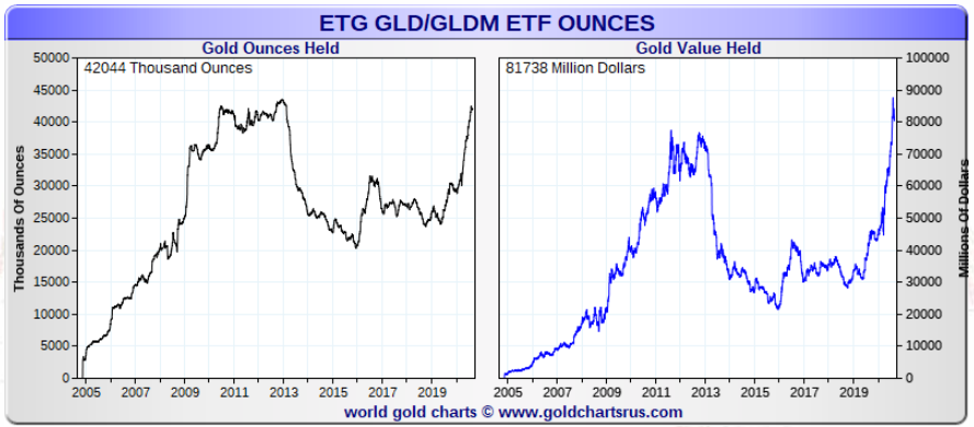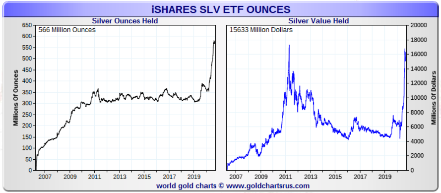 According to GoldChartsRUs.com, there is supposedly 42 million oz (Moz) of gold held in the vaults backing the GLD ETF and 566 Moz in the SLV ETF. Again, no one knows for sure how much of the metal is stored in the GLD & SLV inventories. Worse yet, some metal may have more than one owner.