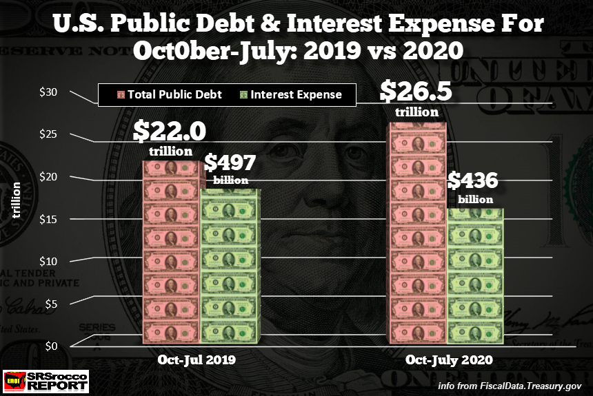 Regardless, if we look at the following chart, Americans need to start waking up. With the U.S. Debt now $4.5 trillion higher than it was a year ago, the interest expense Uncle Sam paid to Bond Holders is $61 billion less. That’s correct. Even though the U.S. public debt has ballooned to $26.5 trillion (July 31st, 2020) versus $22.0 trillion (July 31st, 2019), Uncle Sam only paid $436 million in interest expense in the first ten months of the fiscal year (Oct-July).