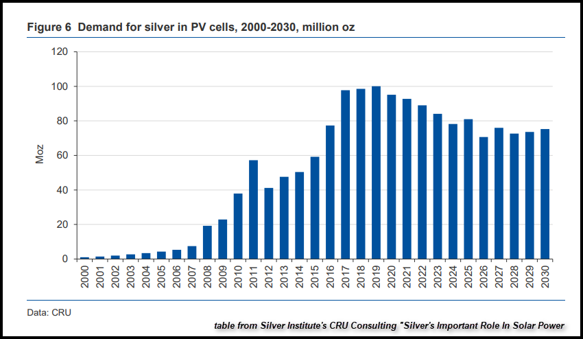 According to the new Silver Important Role In Solar Power Report by CRU Consulting for the Silver Instutite (June 2020), silver consumption in PV Solar Cells will continue to trend lower until 2026 and then remain flat until 2030. Also, the Metals Focus Consultancy stated in the Silver Institute’s 2021 Interim Report, that silver demand in PV Solar will fall 11% in 2020.