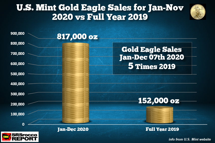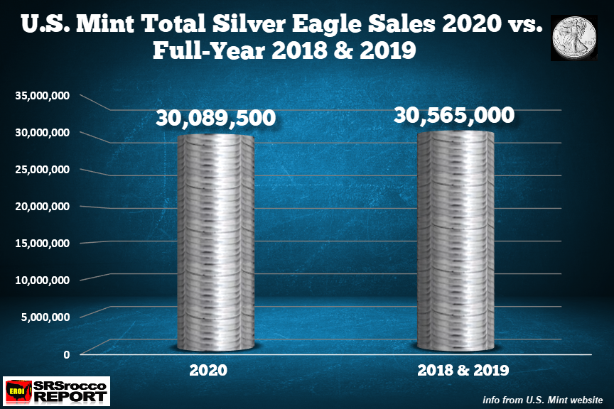 What’s amazing about the 2020 Silver Eagle sales? They are almost the same amount compared to full-year 2018 and 2019 combined.