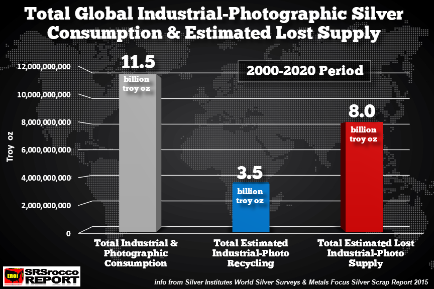 However, since 2000, the Industrial and Photographic sectors of the silver market consumed 11.5 billion oz of silver. The estimated total recycled silver from the industrial and photographic sector was approximately 3.5 billion oz. In the last two decades, 8 billion oz of silver supply is likely lost forever.