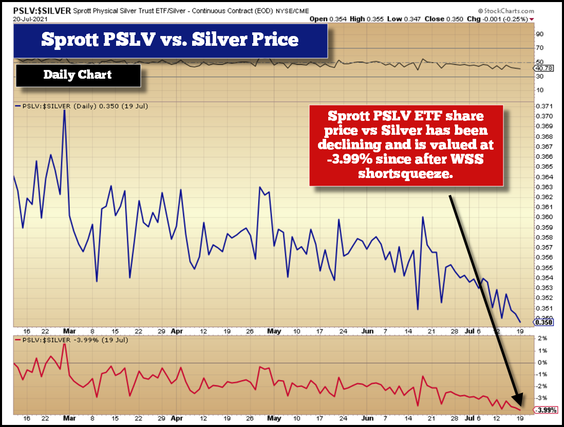 Here is the Sprott PSLV vs. the Silver Price (Ratio) since the WallStreetSilver ShortSqueeze Campaign in February.