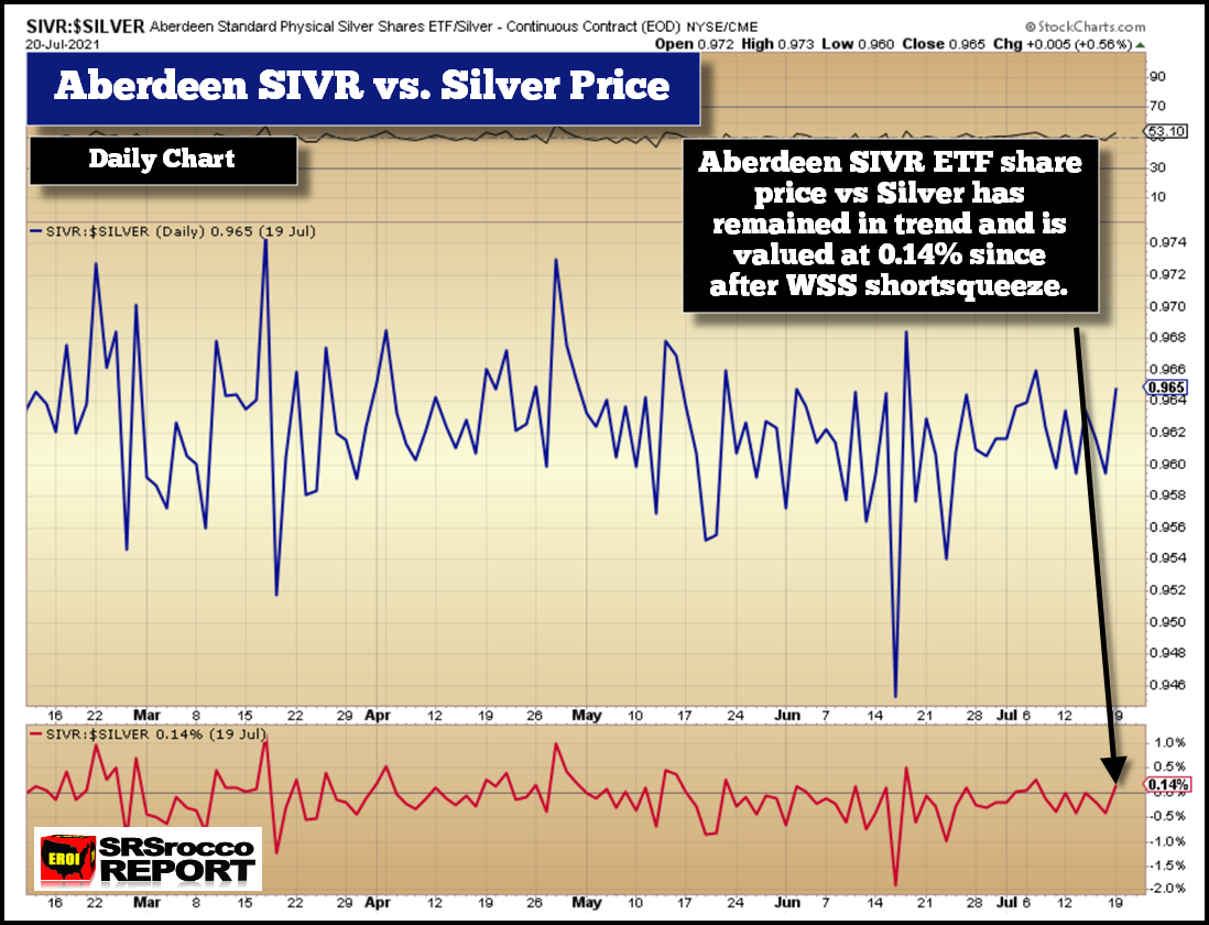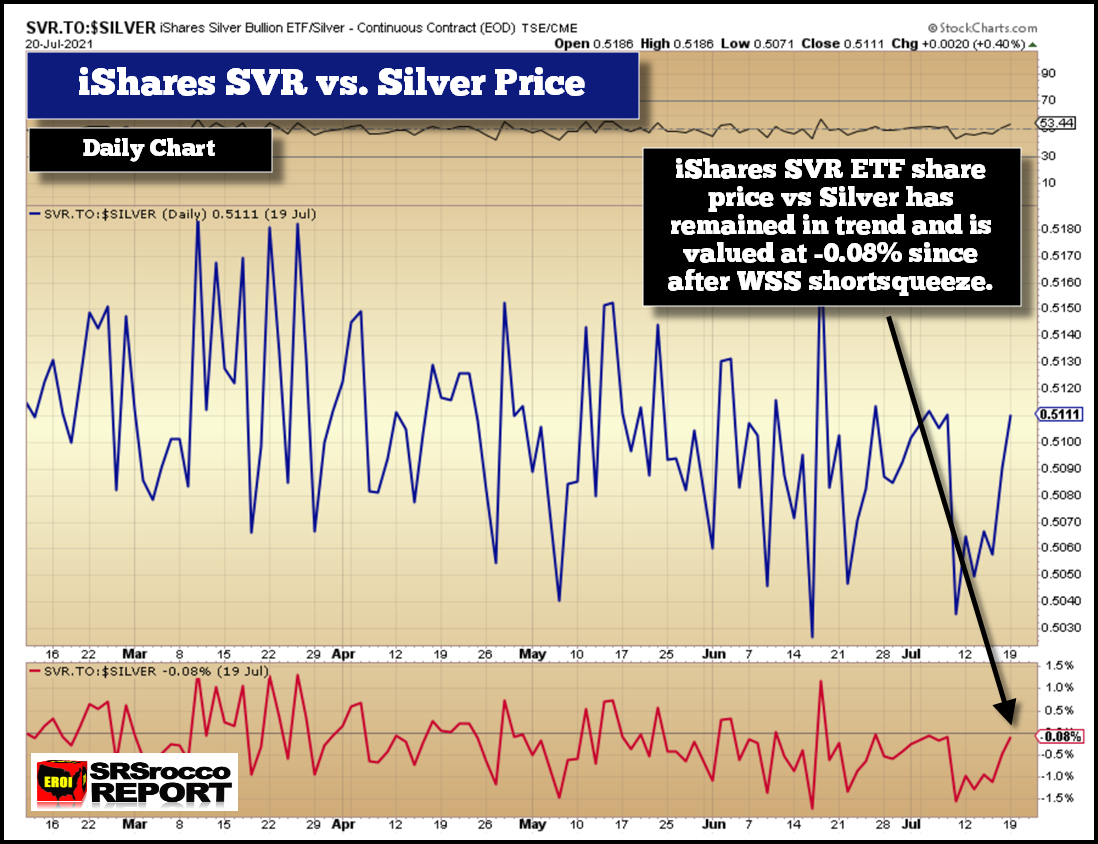 Now… I’d imagine some of you are saying that all the other Silver ETFs are likely manipulating their inventories and data to keep their Premium to Silver much closer than the Sprott PLSV. Really? Well, did you know that Blackrock has another iShares Silver ETF in Toronto called the SVR ETF, which stores its metal at the Royal Canadian Mint… just like the Sprott PSLV??