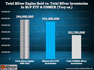 Smart silver investors now hold more Silver Eagles than the total inventories at the iShares SLV ETF or the COMEX. For the past 36 years, since 1986, investors have been buying every Silver Eagle issued by the U.S. Mint. With over a half-billion Silver Eagles now held by private investors, less than 1%