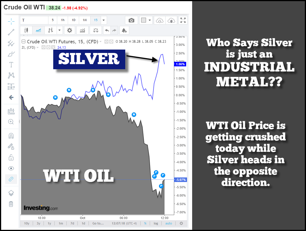 As we can see, copper is down 5% while silver is up 2%. Thus, the leading indicator of the global economy, COPPER, just put out a very BAD SIGNAL, indeed. Now, if silver was just a mere industrial commodity, why didn’t it’s price follow along with copper???