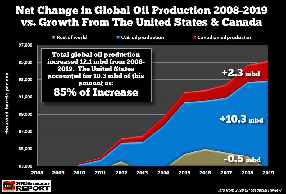 Here is another example as to why energy should be a factor in all analysts’ forecasts, even if the analysis only focuses on certain sectors of the economy and market. Over the past decade, the U.S. Shale Oil Industry was responsible for the overwhelming majority of global oil production growth. This is of great importance to market analysis because without oil production growth, there can be no GDP growth. Unfortunately, most economists tend to overlook this important relationship.