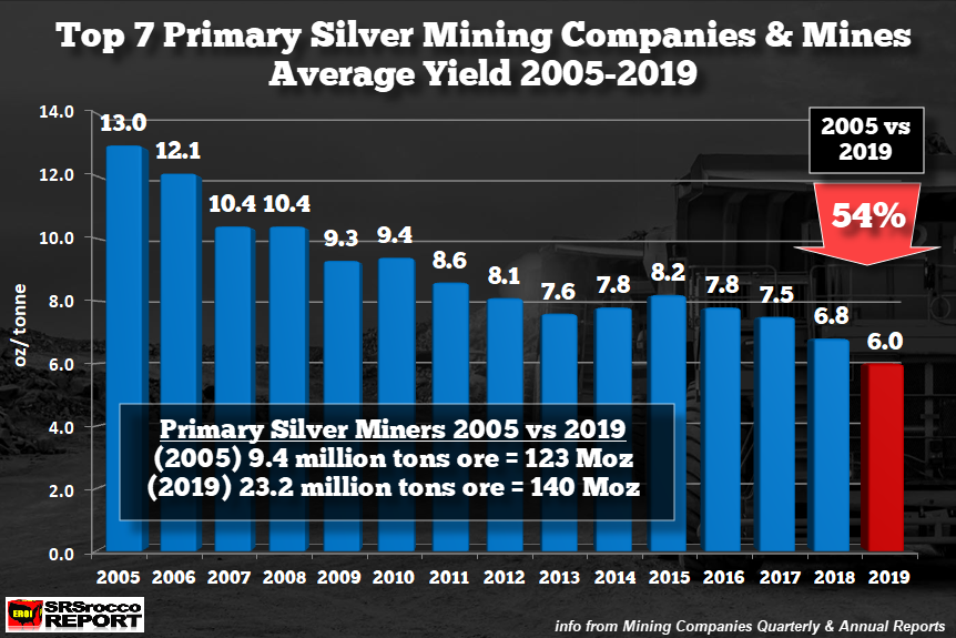 Moreover, we are one of the only websites that provide detailed analysis of the primary silver mining industry’s average production yield. Why is this important? Because the average cost per ounce to produce silver has increased from $5 in the early 2000s to a current price of over $15. While rising energy costs impacted the cost to produce silver, falling ore grades were also a significant factor.