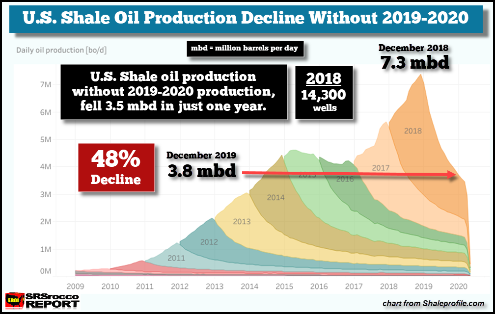 Each year, the U.S. Shale Oil Industry suffers a near 50% production decline rate. To attempt to reverse this trend, it took the shale industry the addition of more than 14,000 wells to increase production to 7.3 million barrels per day (mbd) by the end of 2018. Yet, the investment was futile, and yielded a stunning 3.5 mbd decline in just one year. Regrettably, the U.S. shale oil industry is not a long-term sustainable business model, due to the ramifications of its rapid decline rate, which has been a constant trend for more than a decade.