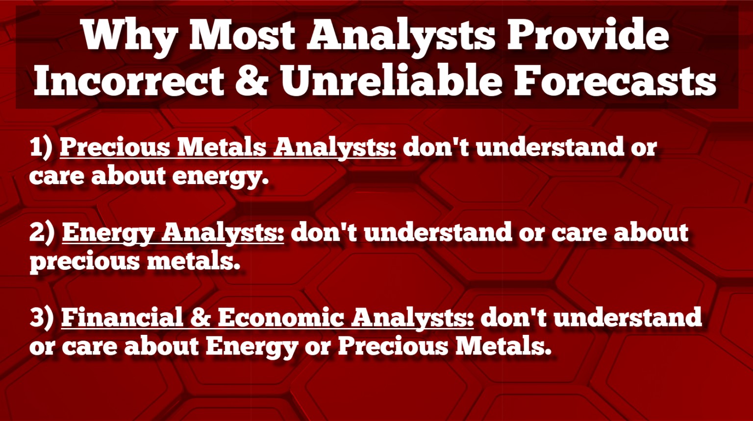 Most precious metals analysts fail to understand energy, while energy analysts tend to ignore precious metals. However, it seems that the worst of the bunch is the financial and economic community, whose members typically don’t understand or care to learn about energy or precious metals. Thus, investors who are trying to figure out how to best maneuver through their financial futures are being advised by a group of highly-specialized analysts that fail to connect the “Energy Dots.”